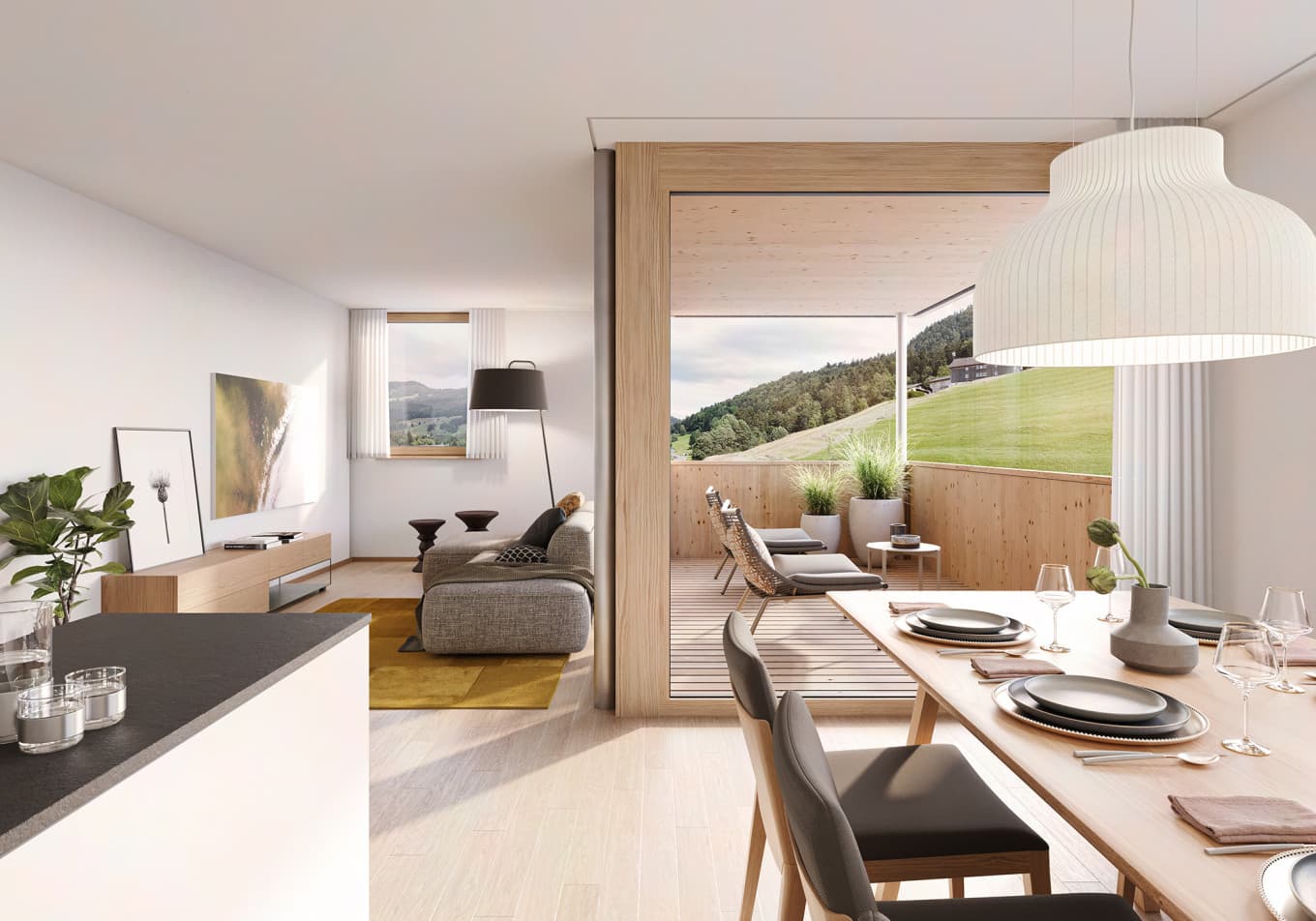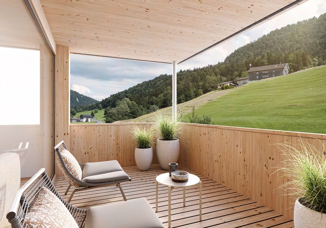 Wohngesundheit und Komfort stehen im Mittelpunkt. Holz als dominanter Baustoff schafft innen wie außen eine natürliche Atmosphäre und ist ein echtes Wohlfühlelement. Die barrierefreie Erschließung durch den Aufzug macht das Wohnen für alle Generationen komfortabel und zukunftstauglich.